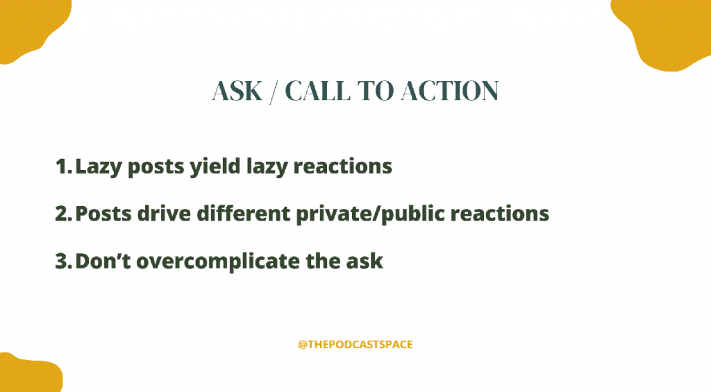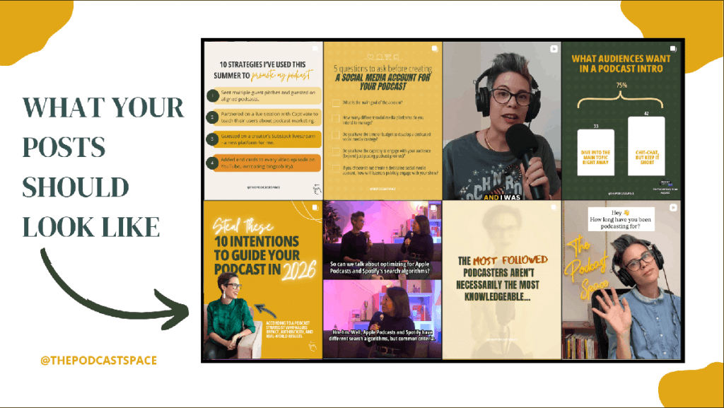 And when it comes to calls to action, keep it to one ask per post. Don’t ask people to listen, subscribe, share, and leave a review all in the same caption. One post, one clear next step.