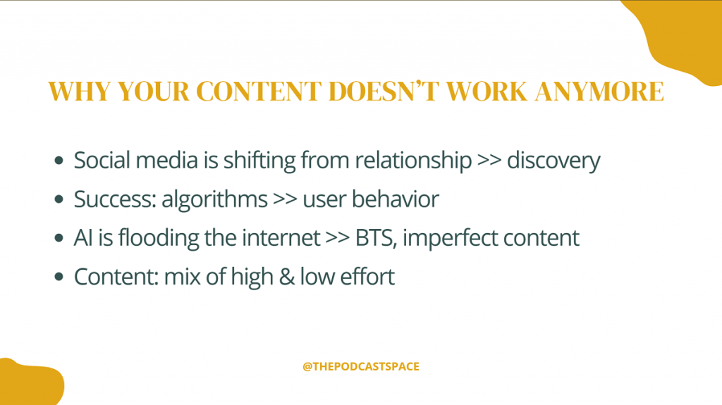With AI-generated content flooding every platform, a lot of podcasters are asking: what’s the point of showing up? Ana’s answer was simple. AI can’t replicate you. Your behind-the-scenes moments, your imperfect selfies, your genuine reactions to landing a dream guest or hitting a milestone: that’s the stuff audiences connect with.