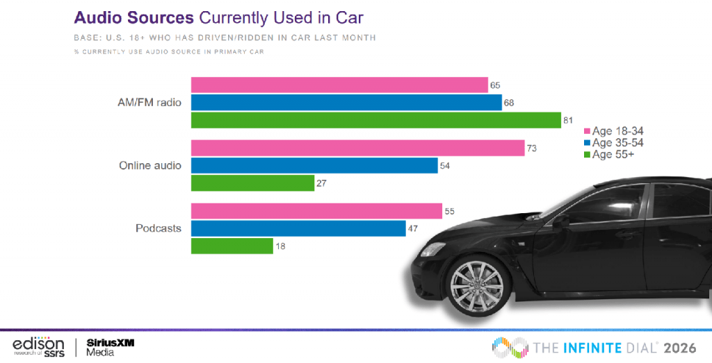 According to the 2026 Infinite Dial report from Edison Research, 37% of Americans who drove or rode in a car in the past month listened to podcasts. Among listeners aged 18–34, that number climbs to 55%. At the same time, 41% of Americans now have Apple CarPlay or Android Auto in their primary vehicle, and 34% actively use those systems.