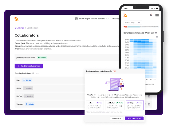 - Colaboración en equipo: Añade miembros a tu cuenta para gestionar distintos aspectos del pódcast