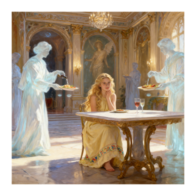 Psiche si risveglia in una valle incantata, dove sorge un palazzo meraviglioso. Si fa coraggio e varca la soglia: scopre così, grazie a delle misteriose voci incorporee, che la padrona di casa è lei. Quella stessa notte lo sposo misterioso la raggiunge e la fa sua.