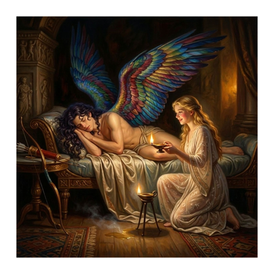 Psyche, goaded on by her wicked sisters, disobeys her unknown husband, who had forbidden her to see him, and creeps up to him whilst he is asleep, intending to kill the ‘monster’, as her sisters had suggested.