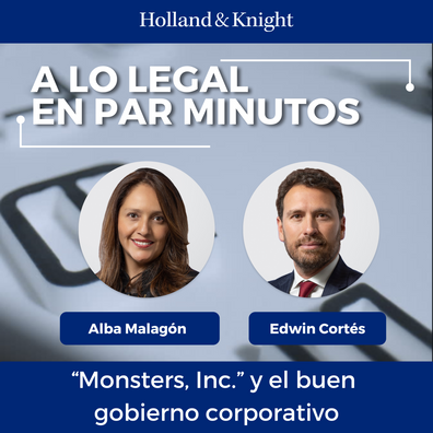 El socio Edwin Cortés conversa con Alba Malagón, socia del área corporativa, sobre el gobierno corporativo en este episodio del podcast "A Lo Legal En Par Minutos". Su análisis aborda una escena de la película "Monsters, Inc." en la que el jefe, el Sr. Waternoose, comete un acto de secuestro. A través de este ejemplo ficticio, la Sra. Malagón explica las posibles acciones preventivas que la junta directiva podría tomar en relación con las conductas del Sr. Waternoose, así como el procedimiento una vez que tengan conocimiento d ...