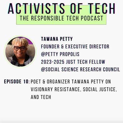 In this highly informative episode, poet & organizer Tawana Petty talks about her data justice centered work, how she empowers her community to think about alternative systems that are not hyper surveilled and rather create a sense of community through her non-profit Petty Propolis, how facial recognition impacts marginalized communities, and much more. These are tough topics as always, but Tawana really made it a feel-good episode full of hope thanks to her energy.