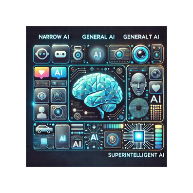 It distinguishes between narrow AI (weak AI), which performs specific tasks, general AI (strong AI) with broad human-like cognitive abilities, and superintelligent AI (ASI), which surpasses human intelligence in all aspects.