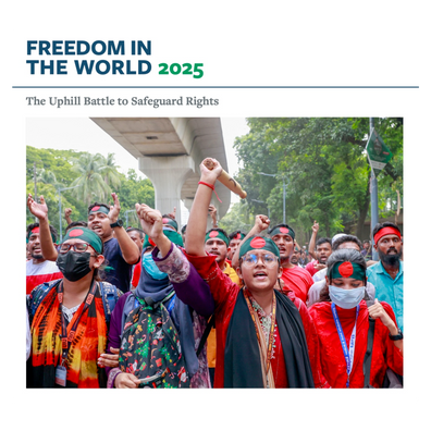 Freedom House's Freedom in the World 2025 report assesses the state of political rights and civil liberties globally, noting a concerning 19th consecutive year of decline in freedom. The report highlights key factors contributing to this decline, including violence during elections, ongoing armed conflicts, and the spread of authoritarian practices. It examines how elected leaders in some democracies are actively undermining institutions designed to ensure accountability, such as the media and the judiciary. The assessment further emphasizes the destabilizing role of nonstate armed groups in various regions, noting how their violence often intersects with corruption and authoritarian interests. The report provides policy recommendations for democracies to address these challenges and support human rights defenders worldwide, suggesting a need for ...