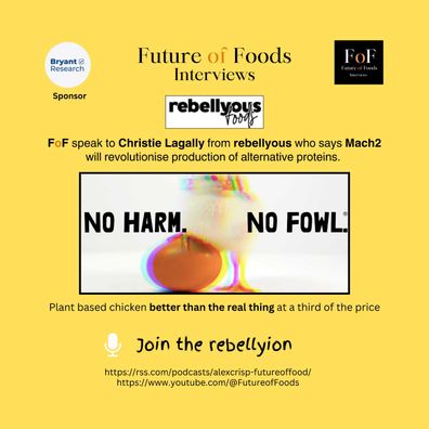 Christie Lagally From Rebellyous Foods talks to Alex, host of FoF. Their new Mock2 production system, which will be fully operational within months, promises to produce plant based chicken at a third of the current price. Christie tells Alex that it tastes better than the real thing.