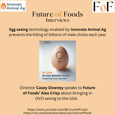 Innovate Animal Ag are a think tank promoting the use of technology to improve standards for animals used in agriculture. They are at the forefront of In OVO sexing technology currently used in 20% of egg hatcheries in the EU and soon to be introduced to the USA. Without such technology as many as 7 billion male chicks are killed pointlessly each year. Future of Foods speaks to director Casey Downey on the many and varied ways of telling whether an egg is a male or a female.