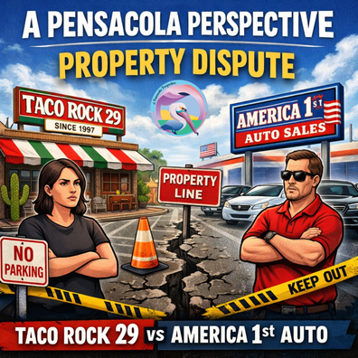 In this episode of A Pensacola Perspective, I take a closer look at a property dispute involving Taco Rock 29, a long-standing local business operating on Pensacola Boulevard since 1997, and a newer neighboring business, America 1st Auto Sales. What began as a disagreement over parking and property boundaries has allegedly escalated into harassment, legal filings, police involvement, and fear for those at the center of it.