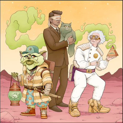 In Episode 1 our players wake up in a kaleidoscopic desert, meet a talking cat (Lord Meow-Meow) and his pet human Dave, an Onirimancer named Dr. Emmet Flux, and Jetu Heladay — a three-eyed trans-dimensional tourist carrying a depressed fish called Neville.