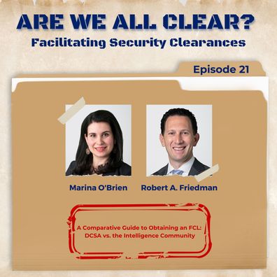 In this episode of "Are We All Clear? Facilitating Security Clearances," host Marina O'Brien talks with Robert A. Friedman, co-head of Holland & Knight's International Trade practice and a leader of the firm's National Security & Defense Industry Group, about intelligence community (IC) security clearances. They discuss how IC clearances differ from the processes used by the U.S. Department of Defense (DOD) and Defense Counterintelligence and Security Agency (DCSA), highlighting that IC clearances are contract-specific, often less pres ...