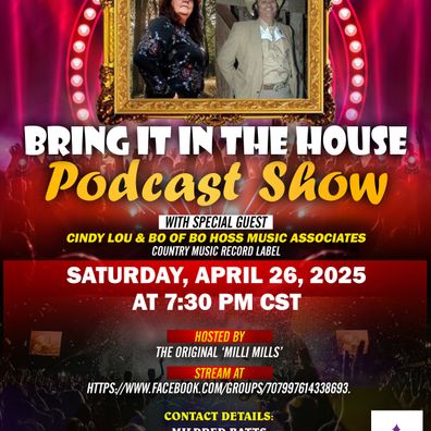'BRING IT IN THE HOUSE' - is a 30-minute talk/entertainment Podcast Show that spotlights (M)usicians, (E)ntertainers, (A)rtists, and (L)eaders...get your M.E.A.L.! In this episode, host Milli Mills speaks with International Country Music Recording Artists/Record Music Group, CINDY LOU & BO HOSS, Saturday, April 26, 2025, at 7:30 pm CST. Stream live at https://www.facebook.com/groups/707997614338693.