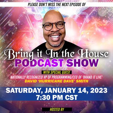 'BRING IT IN THE HOUSE' - is a 30-minute talk/entertainment Podcast Show that spotlights (M)usicians, (E)ntertainers, (A)rtists, and (L)eaders...get your M.E.A.L.! In this episode, host Milli Mills speaks with Nationally Recognized VP of Programming/CEO of 'Brand it Live', DAVID 'HURRICANE DAVE' SMITH, Saturday, January 14, 2023, at 7:30 pm CST. Stream at https://www.facebook.com/groups/487609745652752.