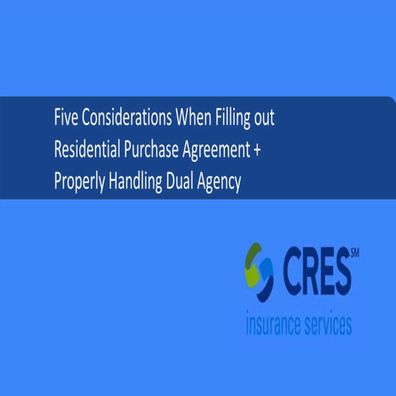 In this webinar, Mark Carlson, an attorney from Carlson Law Group, and Dave Miller, who manages the CRES Advantage Home Warranty Program, discuss 5 key issues to consider when filling out the Residential Purchase Agreement (RPA), including: