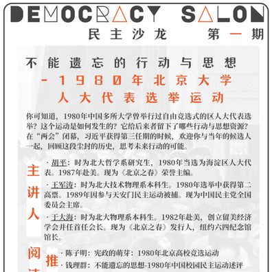 你可知道,1980年中国多所大学曾举行过自由竞选式的区人大代表选举?这个运动是如何发生的?它给后来者留下了哪些行动与思想资源?让我们与亲历者胡平、王军涛、于大海一起回顾这段尘封的历史,思考未来行动的可能。