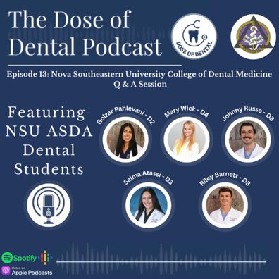 Welcome back to the 13th episode of the Dose of Dental Podcast. In this episode, we held a Q & A session with Nova Southeastern University College of Dental Medicine students: D2 Golzar Pahlevani, D3s Johnny Russo, Salma Atassi, Riley Barnet, and D4 Mary Wick. The current NSU e-board tackles questions from pre-dentals about the application process, extracurriculars that give you an advantage, and life as a dental student at NSU. NSU ASDA Page: https://www.instagram.com/nsuasda/?hl=enReach out to the Dose of Dental Podcast Instagram: https://www.instagram.com/doseofdentalpodcast/