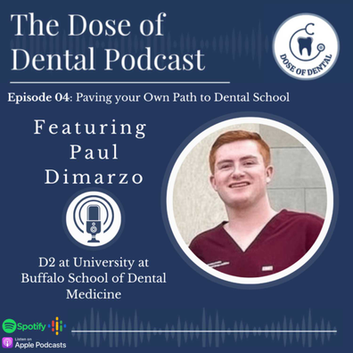 Welcome back to the fourth episode of the Dose of Dental Podcast. In this episode, Paul Dimarzo, a current D2 dental student at the University at Buffalo School of Dental Medicine, speaks about his pre-dental and dental school experiences. Paul extensively covers his undergraduate experience, which included building skills from outreach trips, assisting, and his application to dental school. In dental school, As a D2, Paul tells us how these skills have helped him succeed in dental school, and gives us a glimpse into life as a D2 student in Buffalo. You DO NOT want to miss this episode as Paul shows us how he paved his own path to dental school.