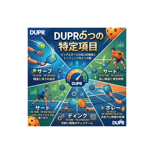 DUPRの5つの特定項目(サーブ/リターン/サード/ディンク/ボレー)5 specific areas of DUPR (serve/return/third/dink/volley)