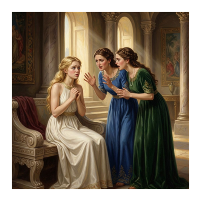 The naive Psyche falls into the trap set by her wicked sisters, who suggest a criminal plan: they make her believe she is the lover of a horrible monster and explain how to kill him.