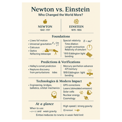 "Newton vs. Einstein: Who Changed the World More?” systematically compares the two scientific figures across three categories: Predictive Power & Scope, Technological & Everyday Impact, and Conceptual Depth & Philosophical Shockwaves. The segment dedicated to Newton emphasizes his invention of calculus, the laws of motion and universal gravitation, and his role as the "operating system" for modern engineering and the scientific method. Conversely, the segment supporting Einstein focuses on his revolutionary theories of Special and General Relativity, which redefined spacetime and gravity, and his foundational contributions to quantum theory, noting his importance for modern technologies like GPS and cosmology. The debaters ultimately conclude that New ...