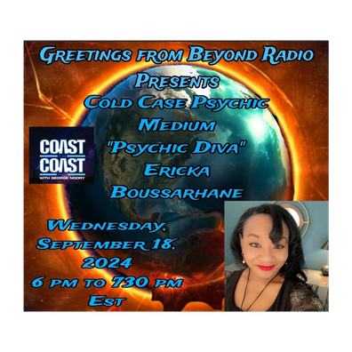 YOU WON'T WANT TO MISS THIS SHOW!!! Greetings From Beyond Radio Welcomes to the Show "Ericka Marcia Boussarhane" a world-renowned Psychic Medium who's been an Author, Speaker, has been on Coast 2 Coast Radio, Film Producer, Event Planner and so much more.