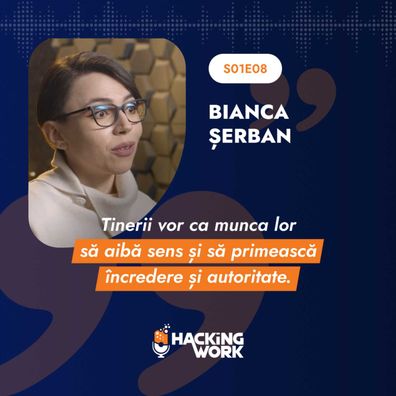 Bianca Șerban este psiholog, psihoterapeut relațional, fost specialist de HR într-o companie IT din Cluj și actual antreprenor. Reprezentant strălucit al Generației Z, un om cu opinii solide și argumente puternice, Bianca privește realitatea din piața muncii cu curaj, acuitate și o onestitate debordantă. Este un om foarte curios, motivat și energic și experimentează deseori starea de Flow, specifică celor care lucrează cu pasiune și concentrare.