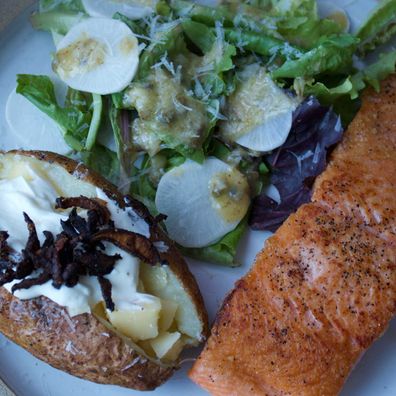 We heard a rumor (from Cook's Illustrated so not really a rumor) that there's a new way to sear steaks. So, we set out to compare the old and new methods and decided to turn this challenge into a classic steakhouse meal. G uses sirloin for her comparison and Becca uses salmon. We round it all out with a baked potato (using G's express method), and a perfect summer salad with a lemon caper vinaigrette. Join us as we learn new tricks, practice old standards, and eat a lot of butter.