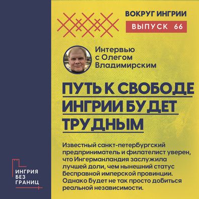 Гость очередного выпуска программы «Вокруг Ингрии» — известный в Санкт-Петербурге предприниматель и филателист Олег Владимирский. Он уверен, что у Ингрии есть прекрасный потенциал для превращения в одну из благополучных республик в Балтийском регионе. Но на этом пути есть и серьёзное препятствие — менталитет жителей мегаполиса и области. Сознание сотен тысяч людей отравлено идеями имперскости. По мнению Владимирского, на сегодняшний день очень важно внимательно изучать историю, чтобы делать правильные выводы и не повторять ошибок прошлого.