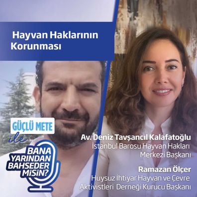 İstanbul Barosu Hayvan Hakları Merkezi Başkanı Av. Deniz Tavşancıl Kalafatoğlu ile Huysuz İhtiyar Hayvan ve Çevre Aktivistleri Derneği Kurucu Başkanı Ramazan Ölçer, hayvan haklarının korunması konusu ile "Bana Yarından Bahseder misin?" podcast kanalımızda Güçlü Mete'ye konuk oluyor.