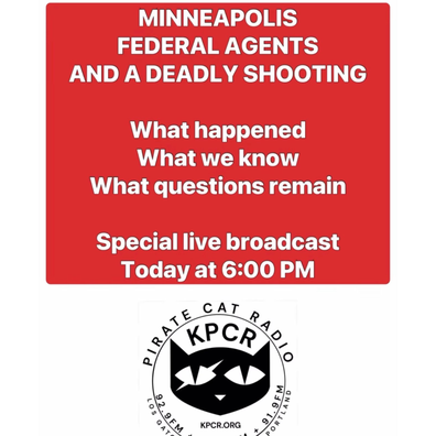 Doktor Jacqueline Dilworth speaks to Lori Chaykin from TWW(Together We Will)/Indivisible Los Gatos at Pirate Cat Radio’s studio, about the events of 1-24-2026. We hear a report from Tamara who lives in Minneapolis, a block away from where Alex Pretti was shot by ICE agents. Tamara talks about how life is in Minneapolis and what she is experiencing. Cecilia Rae, ig @veryceci gives a report about what she’s seeing and hearing from the streets of Minneapolis. Chelsea Gods checks in from San Diego with a report about how to act during a protest and what she is doing to keep going in these times. Finally we hear from Daniel Roberts about Portland and his plans to protes ...