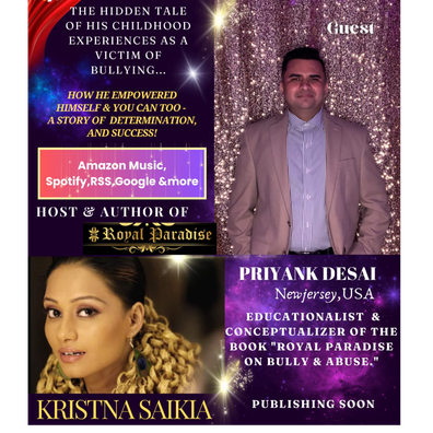 Lets welcome Priyank Desai from New Jersey,US to my Podcast I AM A BILLION DOLLAR STAR- who is a educationalist and conceptualizer of the book 'Royal Paradise'- on bully & abuse, I am the author of this book. It has been an interesting journey for both of us to put together the whole experience of exploring the effect of bullying and abuse in this book,'Royal Par ...Â