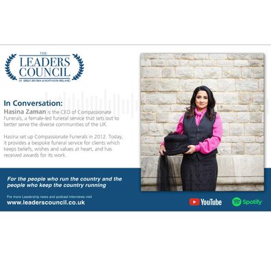 Hasina set up Compassionate Funerals in 2012. Today, it provides a bespoke funeral service for clients which keeps beliefs, wishes and values at heart, and has received awards for its work.