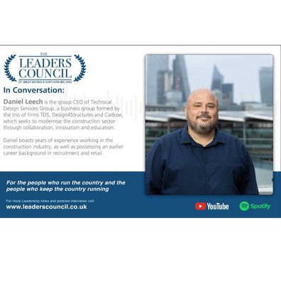 Daniel Leech is the group CEO of Technical Design Services Group, a business group formed by the trio of firms TDS, Design4Structures and Cadcoe, which seeks to modernise the construction sector through collaboration, innovation and education.