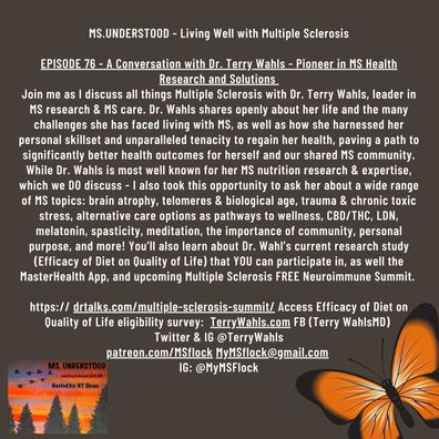 Join me as I discuss all things Multiple Sclerosis with Dr. Terry Wahls, leader in MS research & MS care. Dr. Wahls shares openly about her life and the many challenges she has faced living with MS, as well as how she harnessed her personal skillset and unparalleled tenacity to regain her health, paving a path to significantly better health outcomes for herself and our shared MS community. While Dr. Wahls is most well known for her MS nutrition research & expertise, which we DO discuss - I also took this opportunity to ask her about a wide range of MS topics: brain atrophy, telomeres & biological age, trauma & chronic toxic stress, alternative care options as pathways to wellness, CBD/THC, LDN, melatonin, spasticity, meditation, the importance of community, personal purpose, and more! You’ll also learn about Dr. Wahl’s current res ...