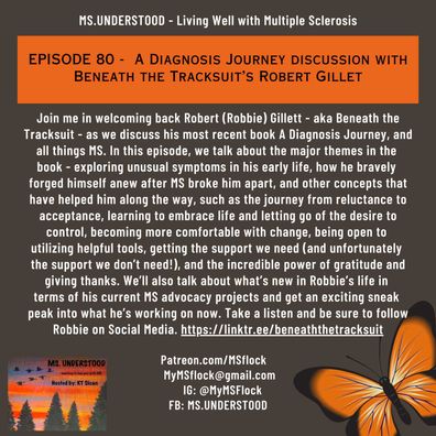 Join me in welcoming back Robert (Robbie) Gillett - aka Beneath the Tracksuit - as we discuss his most recent book A Diagnosis Journey, and all things MS. In this episode, we talk about the major themes in the book - exploring unusual symptoms in his early life, how he bravely forged himself anew after MS broke him apart, and other concepts that have helped him along the way, such as the journey from reluctance to acceptance, learning to embrace life and letting go of the desire to control, becoming more comfortable with change, being open to utilizing helpful tools, getting the support we need (and unfortunately the support we don’t need!), and the incredible power of gratitude and giving thanks. We’ll also talk about what’s new in Robbie’s life in terms of his current MS advocacy projects and get an exciting sneak peak into what he’s working on ...