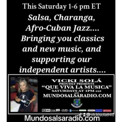 Celebrated Latin music radio program Que Viva La Música, created decades ago by Vicki Solá, now streams worldwide direct from the NYC-metro area on Mundo Salsa Radio (mundosalsaradio.com) Saturday afternoons from