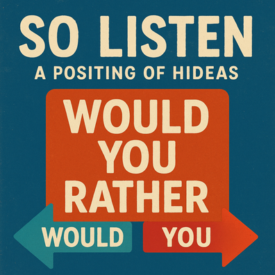 In this episode of So Listen: A Positing of Hideas, Kief and Sage dive headfirst into the classic stoner game of “Would You Rather.” From the absurd to the strangely philosophical, they weigh impossible choices, debate the logic (or lack thereof) behind each option, and find surprising insights hiding in the silliness. It’s laughter, tangents, and thought experiments all rolled into one joint of an episode. If you’ve ever wondered what your choices say about you—or just want to giggle at the bizarre scenarios—this one’s for you.