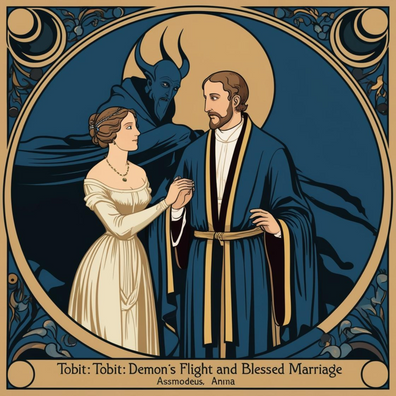 Following angelic instructions, Tobiah uses the liver and heart of a fish to drive away a demon that plagued his new wife, Sarah, ensuring their safety. After the demonic threat is neutralized, Tobiah and Sarah offer a heartfelt prayer for protection and a blessed marriage, demonstrating their faith. Meanwhile, Sarah's worried father secretly prepares for the possibility of Tobiah's death but discovers the couple is alive and well, leading to a joyful celebration and Raguel generously sharing his wealth with Tobiah.