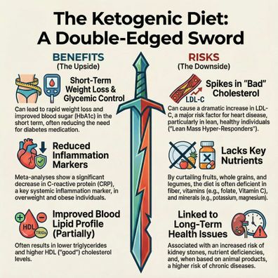 Discussing the health effects of low-carbohydrate and ketogenic diets (CRD/KD), focusing heavily on lipid metabolism and cardiovascular risk. Several articles, including one from the American College of Cardiology, indicate that a "keto-like" diet may be associated with significantly higher LDL cholesterol ("bad" cholesterol) and a doubled risk of major cardiovascular events in some individuals. Other research introduces the "Lean Mass Hyper-Responder" (LMHR) phenotype, which describes leaner individuals with otherwise healthy metabolic markers who experience extreme elevations in LDL cholesterol on a CRD, a response explained by the Lipid Energy Model (LEM). Additionally, the texts explore the use of KD in managing Type 2 diabetes
