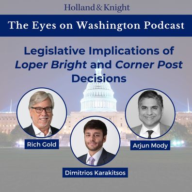 In this episode of "The Eyes on Washington Podcast," Public Policy & Regulation attorneys Rich Gold and Dimitrios Karakitsos sit down with Arjun Mody, Staff Director to the Senate Republican Conference, to cover the legislative aspects of the Loper Bright and Corner Post decisions. The speakers break down how these decisions are going to impact Congress and in particular the Senate and what they mean for advocates before Congress as well as congressional ...