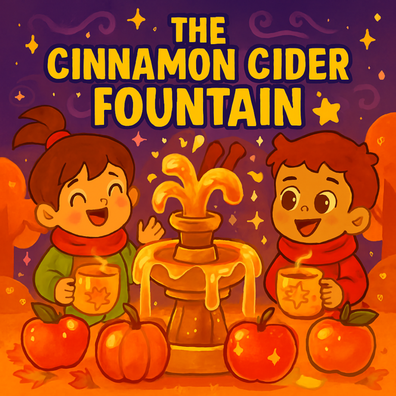 "The Cinnamon Cider Fountain," which details a magical event at Maple Hollow Park. The park's regular water fountain suddenly begins to flow with warm cinnamon apple cider, complete with cinnamon sticks and caramel-drizzled apples. A central conflict arises when the children's rushing and lack of patience cause the fountain to nearly overflow with cider. A tiny cinnamon fairy appears and teaches the children that kindness, sharing, and taking turns are necessary to keep the magic flowing smoothly.
