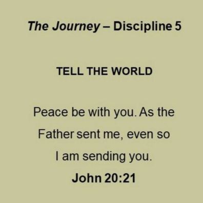 Session 5 of Step 3 in the Step-by-Step Discipleship Process focuses on the fifth spiritual discipline in our Journey with Jesus through the Gospel of John. Discipline #5 - Tell the World - is supported by John 20:21, where Jesus says, "Peace be with you. As the Father has sent me, even so I am sending you.."