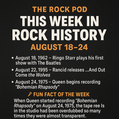 This week in rock is packed with game-changing firsts and legendary moments. Ringo Starr makes his live debut with The Beatles, Queen begins the epic recording of “Bohemian Rhapsody,” and Rancid drops …And Out Come the Wolves, igniting the ’90s punk revival. Plus, The Beatles launch their first North American tour, Crosby, Stills, Nash & Young hit Woodstock for only their second public show, and Alice Cooper sparks chaos with a last-minute concert cancellation. From overdubbed tapes to overnight legends, it’s another week of pure rock ’n’ roll history.