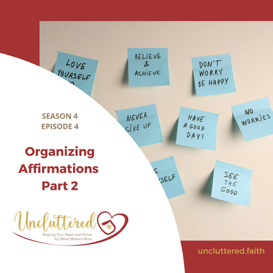 Angie and Liana continue their series on organizing affirmations offering eight more empowering statements to help listeners clear clutter and build a more organized life. Affirmations like "I can use my excess to bless others" and "My organizing journey is not a sprint, but a marathon" encourage positive thinking and spiritual growth. With practical insights and Biblical wisdom, this episode equips listeners to break free from disorganization and embrace a peaceful, intentional lifestyle. Don't miss these powerful tools for your organizing journey on the latest episode of the Uncluttered podcast!