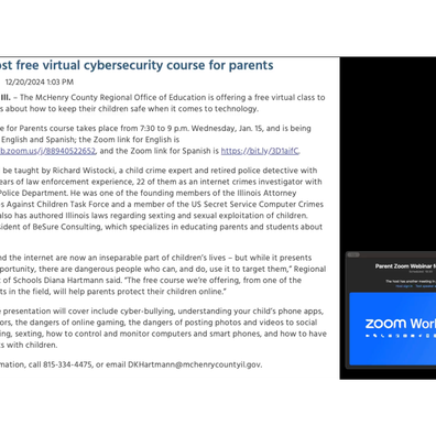 McHenry County Regional Office of Education hosts free virtual cybersecurity course for parents. We watch together. ROE to host free virtual cybersecurity course for parentsWOODSTOCK, Ill. – The McHenry County Regional Office of Education is offering a free virtual class to educate parents about how to keep their children safe when it comes to technology.The Cyber Guide for Parents course takes place from 7:30 to 9 p.m. Wednesday, Jan. 15The course will be taught by Richard Wistocki, a child crime expert and retired police detective with more than 30 years of law enforcement experience, 22 of them as an internet crimes investigator with the Naperville Police Department. He was one of the founding members of the Illinois Attorney General’s Crimes Against Children Task Force and a member of the US Secret Service Computer Crimes Task Force; he also ...