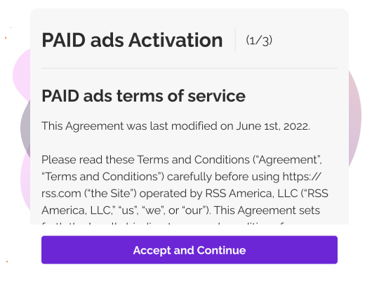 Enter your PayPal email for payouts. RSS.com validates your account by sending one cent to confirm it's active. Once validated, you'll receive confirmation and your ads go live.