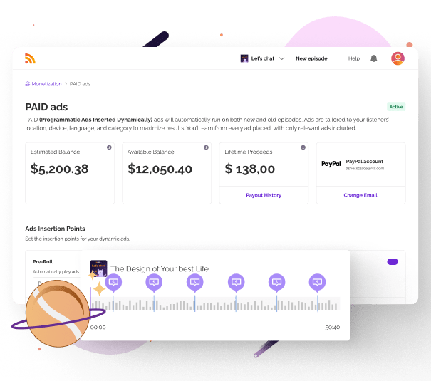 Set it up once and start earning. PAID inserts ads into all your episodes automatically, including your entire back catalog. No manual work, no sponsor outreach, no complex negotiations. Just activate the feature in your dashboard and ads start running based on real-time demand.